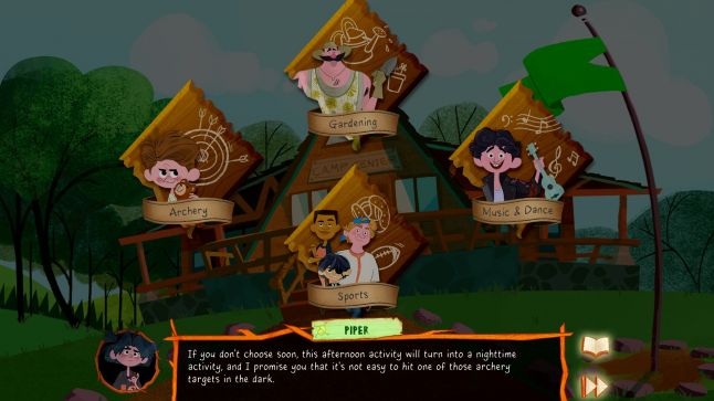 A simple example of this in the game is the choice of camp activity. You are repeatedly tasked with picking between arts and crafts, music and dance, and camp history, with the decision impacting on where the story takes you next and who you interact with.