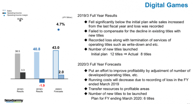 Sega explained its failure to launch more new titles meant it struggled to offset declining catalog sales. The company had initially hoped to launch 12 new digital games by the end of this fiscal year, but only managed to churn out eight.